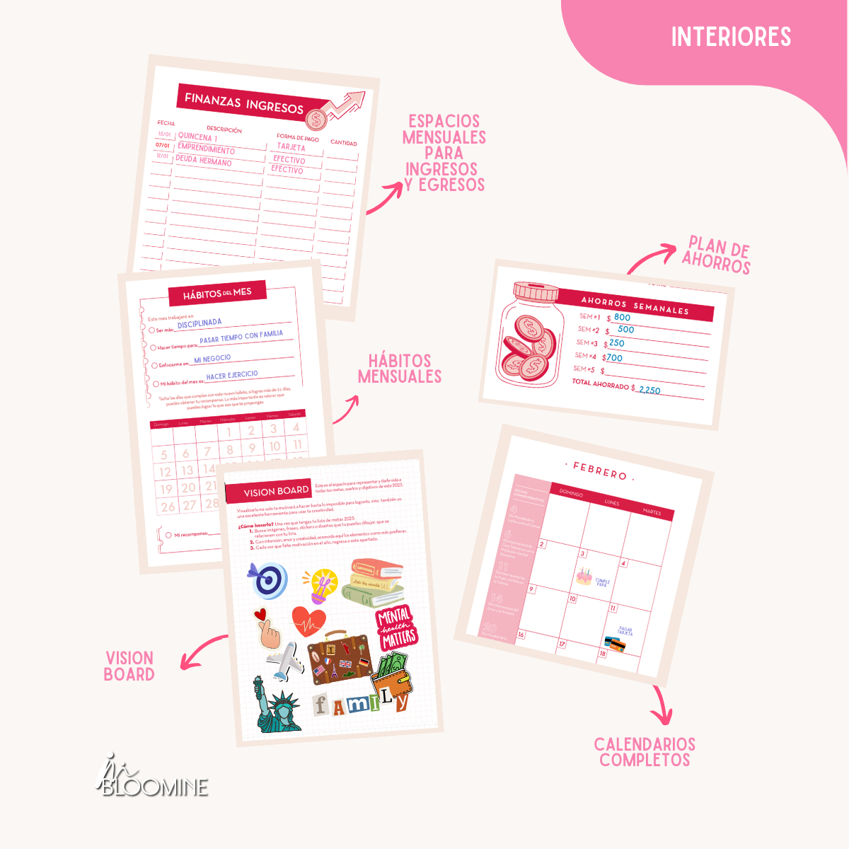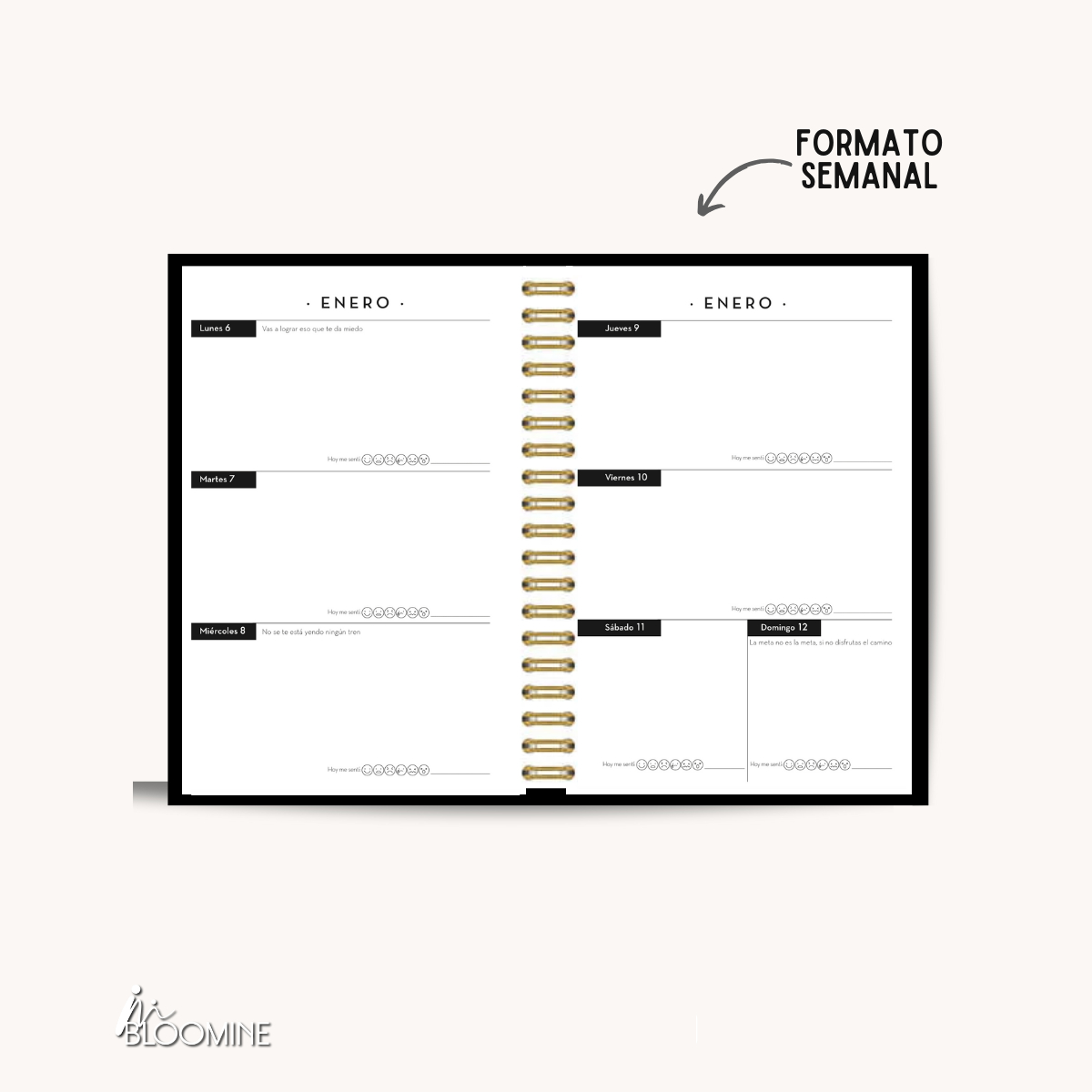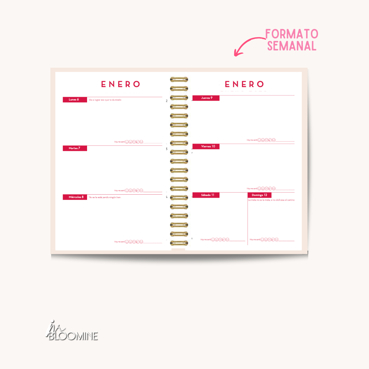 Agenda Psicoemocional Bloomine 2025: Diseñada para acompañarte en el autoconocimiento y bienestar emocional, esta agenda es más que una herramienta de organización: te guía a conectar contigo mismo cada día. Con secciones de gestión emocional y desarrollo personal, permite trabajar en metas y emociones en un solo lugar. Ideal para quienes buscan equilibrio y propósito en 2025.